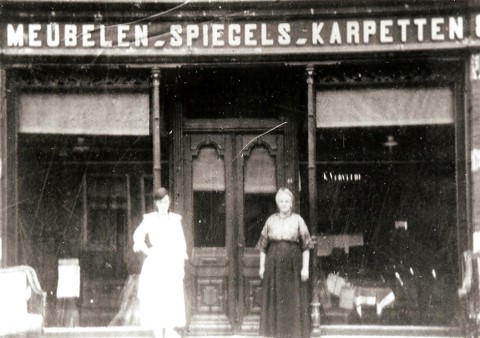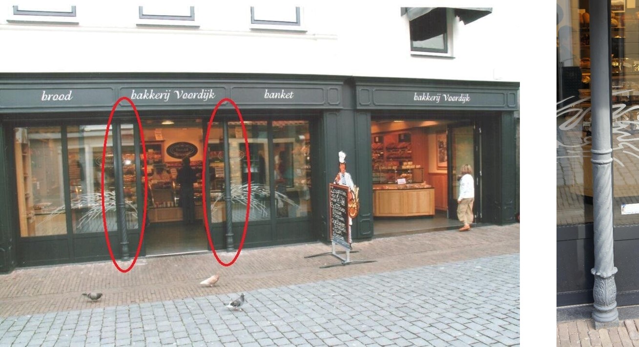 Het zal niet iedere voorbijganger opvallen, maar deze kolommen maken onderdeel uit van het oorspronkelijke ontwerp van Molendijk 44 en waren er al toen Karel Vervelde op deze locatie een winkel in meubels, spiegels en karpetten uitbaatte.